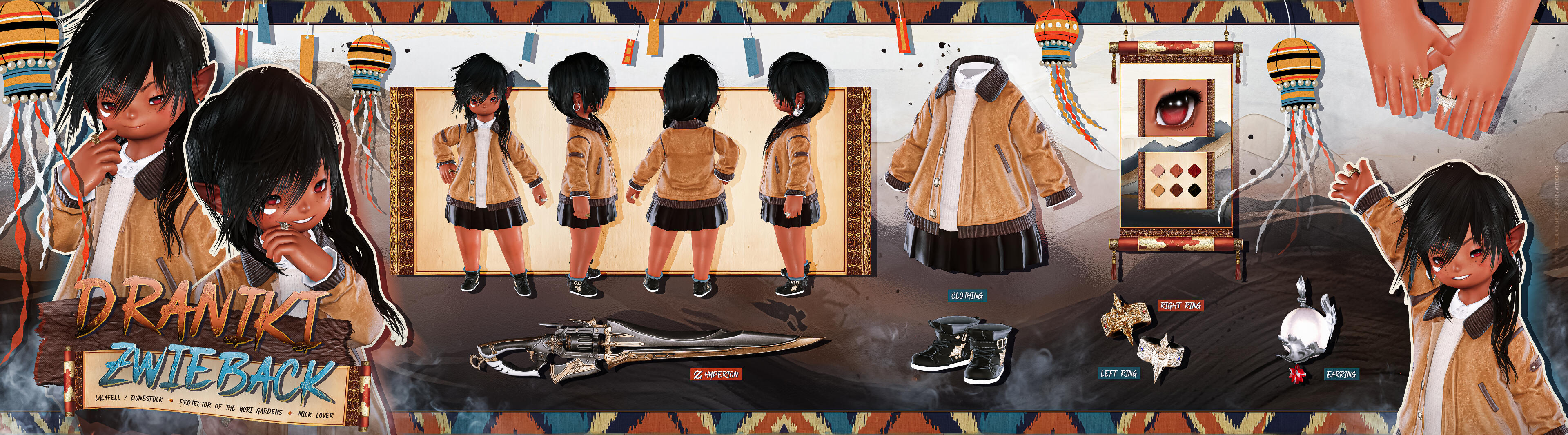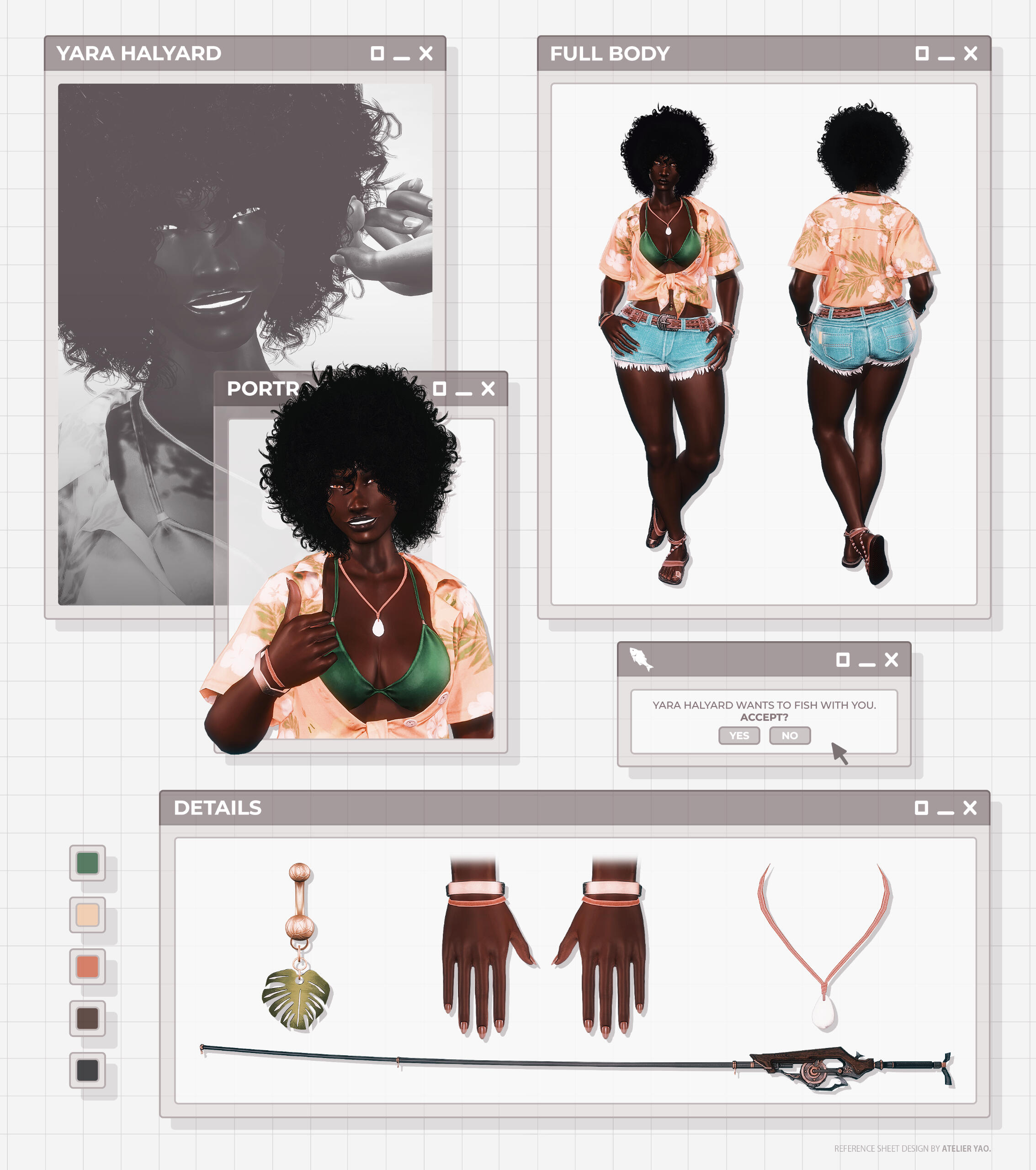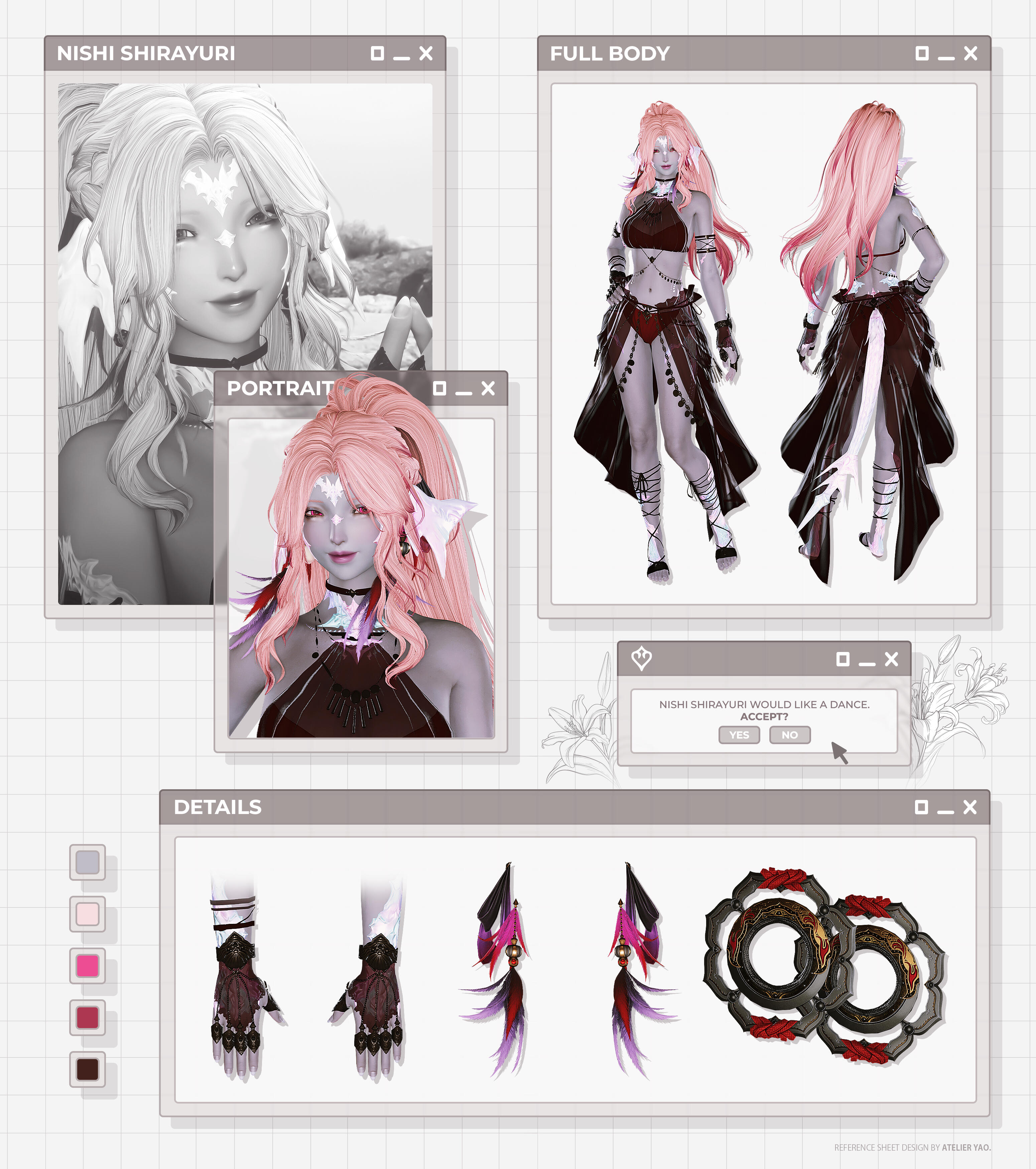 •   RP Carrds:   Standard RP pages (OOC Rules, Dossier, Hooks, Bonds, Gallery). Gposes for section banners (if any), profile portrait, little accent images, and full body + weapon PNG spread are also included.