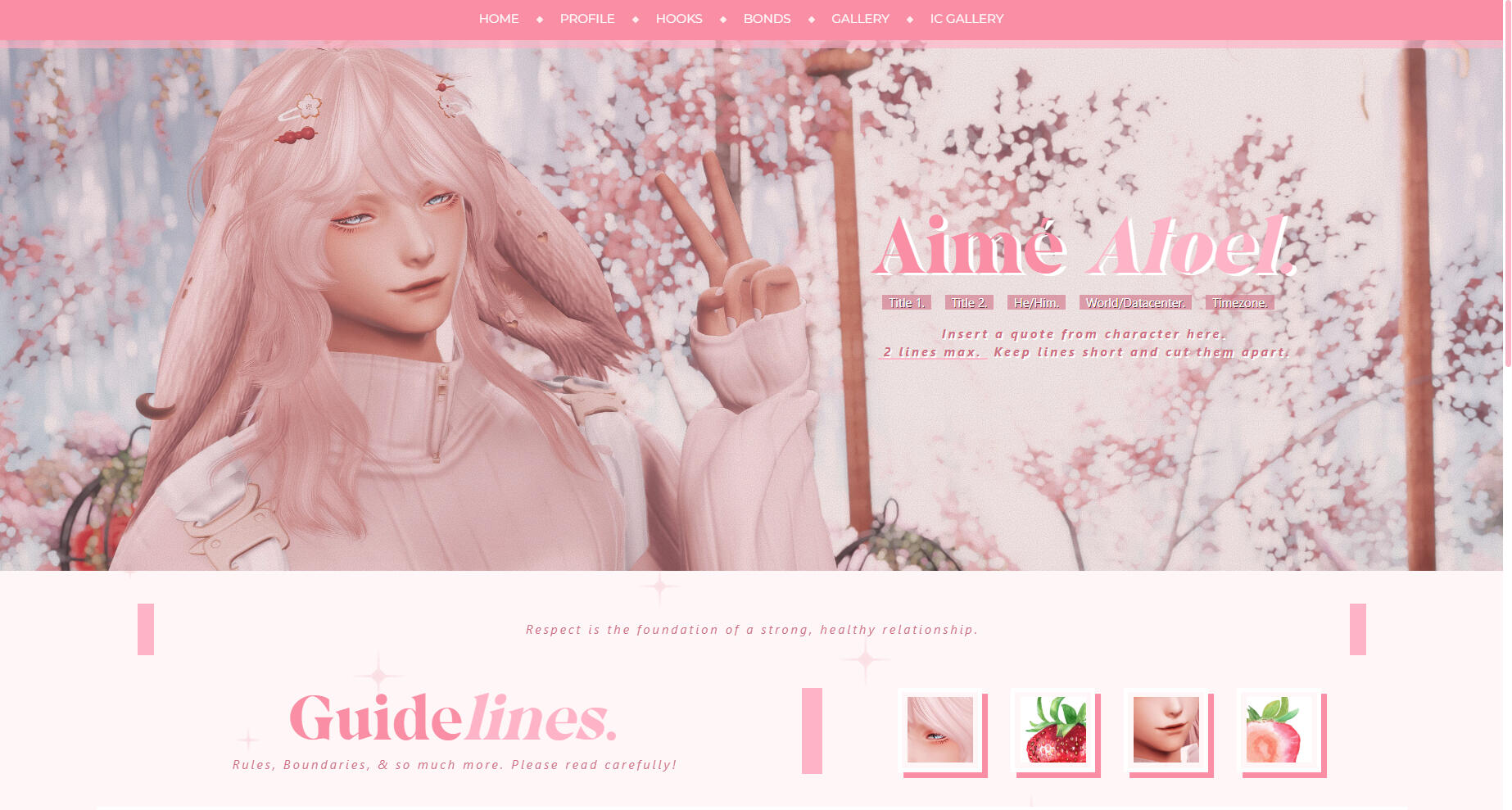 •   FEATURES:   Profile / Hooks / Gallery / OOC pages for RP, full body/weapon pngs, basic aesthetic embeds, advanced embeds, floral and marble graphics, external font.